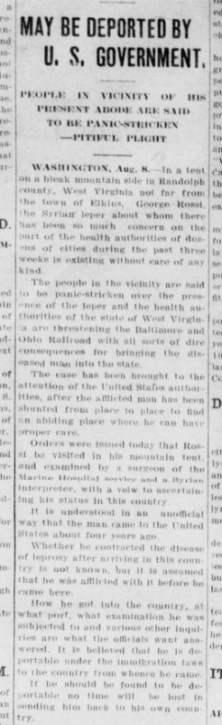 The newspaper article you sent is titled "MAY BE DEPORTED BY U.S. GOVERNMENT." It is about a Syrian leper named George Rosten who is living in a tent on a mountainside in Randolph County, West Virginia. The article states that the people in the vicinity are "panic-stricken" over Rosten's presence, and that the West Virginia health authorities are threatening to deport him.